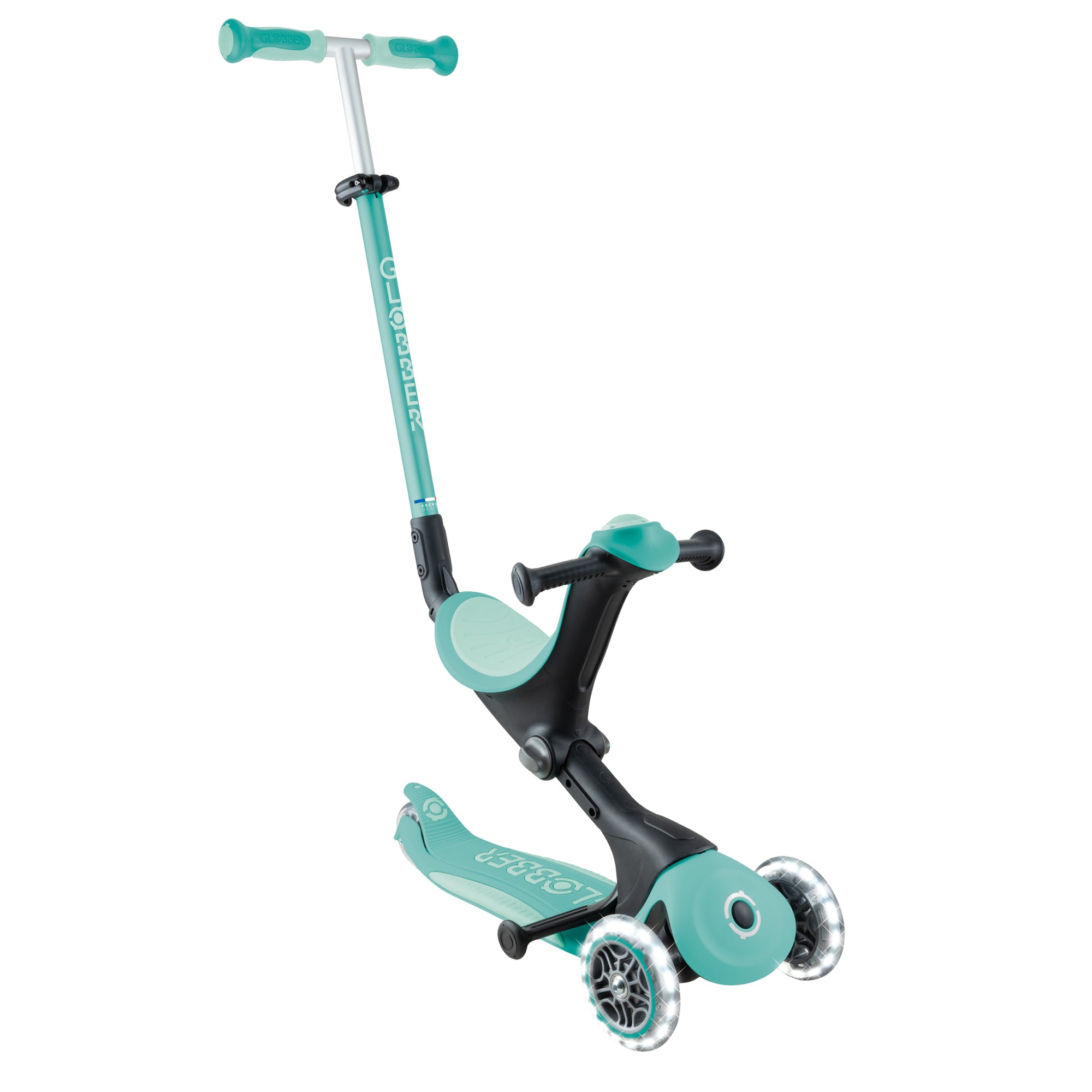 The Go Up Deluxe has been designed for children from 15 months up with three modes; ride-on, walking bike and scooter. Its patented folding system switching from scooter to trolley mode with ease. The Deluxe Lights introduces an exclusive light-up powered module activated by vibrations when in use.