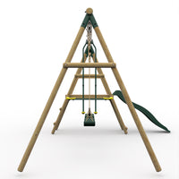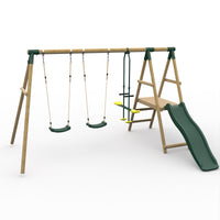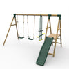 Children can swing, climb and slide with the Plum® Lesula Wooden Swing Set with Slide.