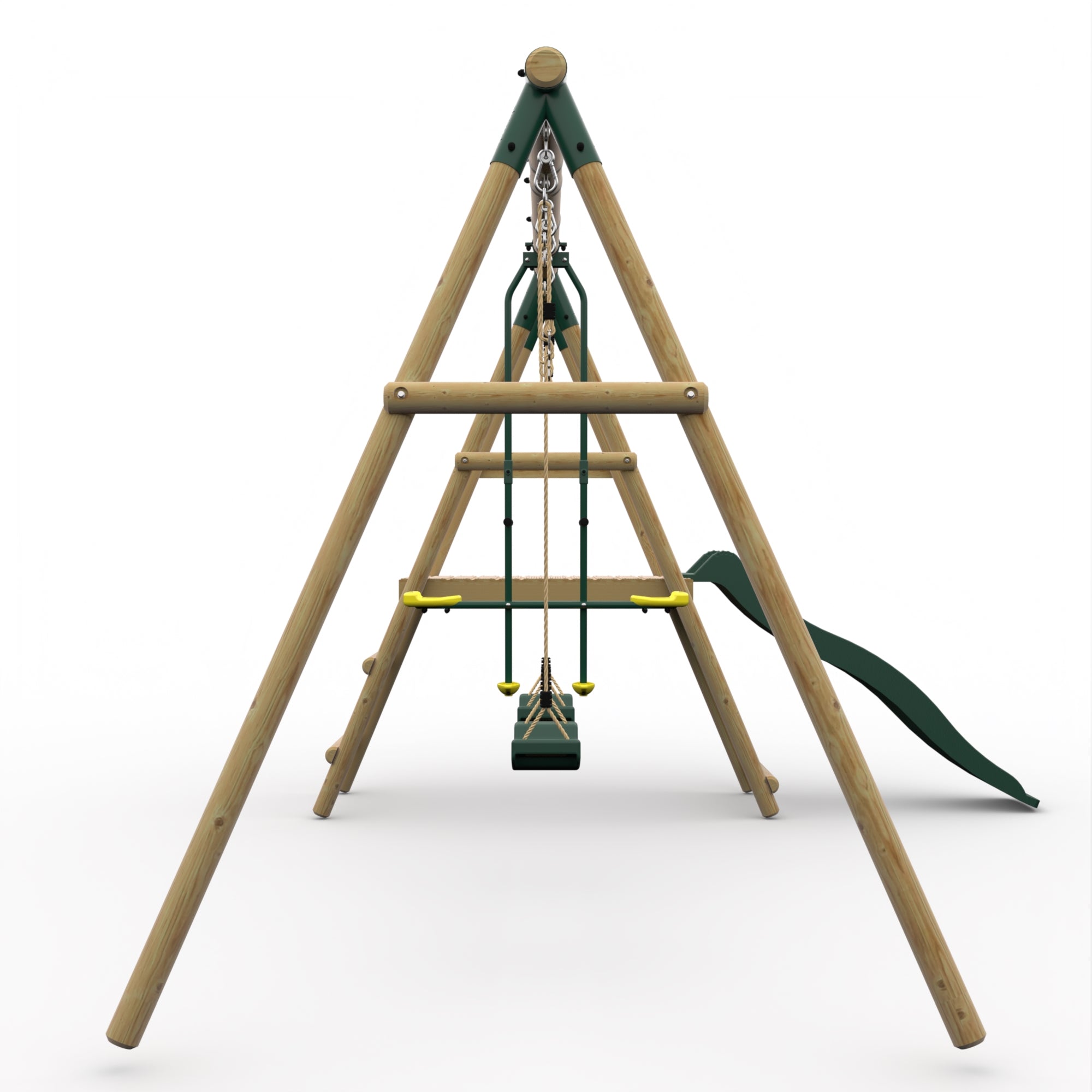 Made from FSC certified timber, Plum® round pole swing frames are pressure treated for greater strength and durability. A cross brace runs across the frame legs to add stability and form the A frame.